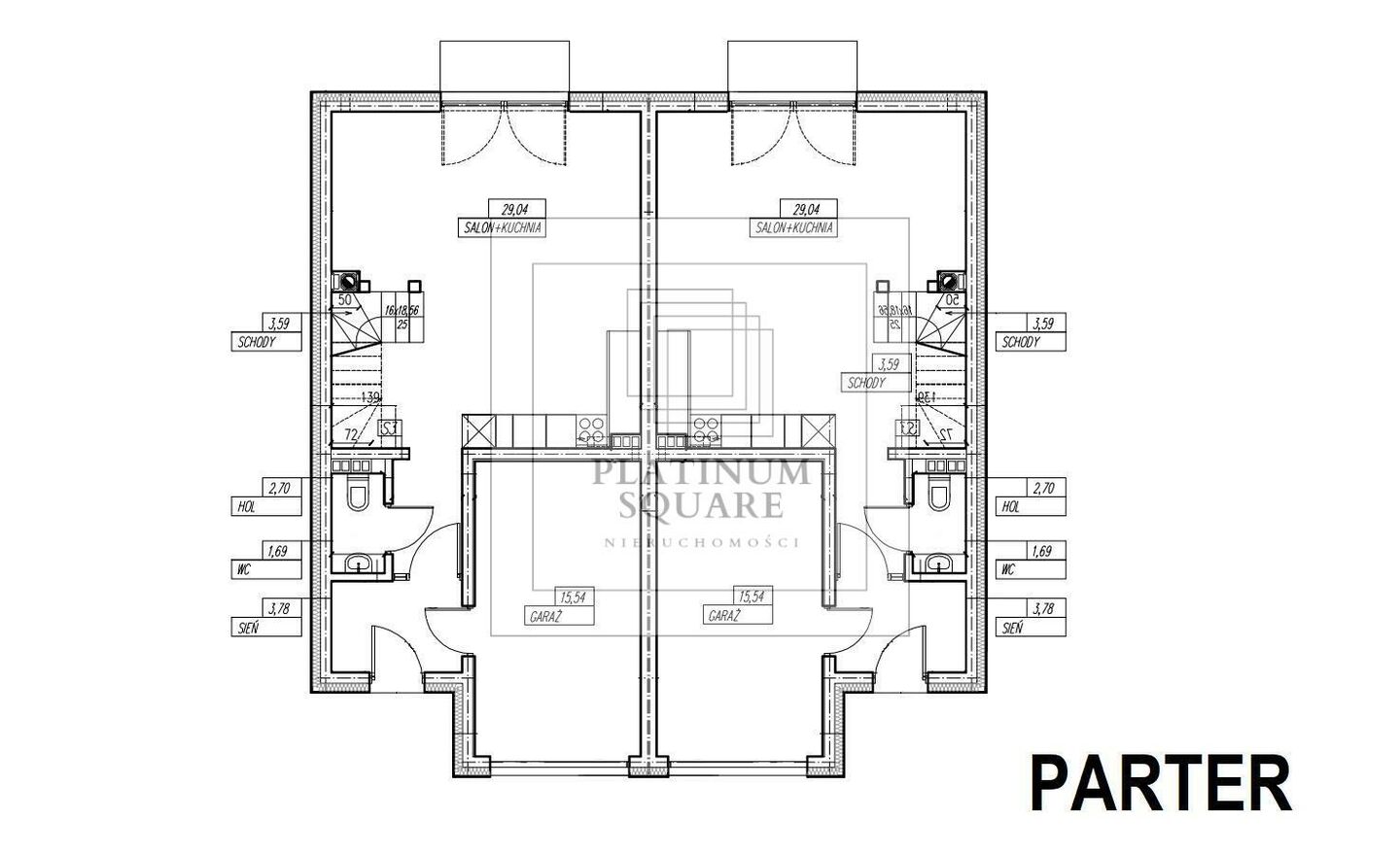 Wiatrołap 3,78 m Korytarz 2,70 m Łazienka 1,69 m Salon z aneksem kuchennym 29,04 m Garaż 15,54 m